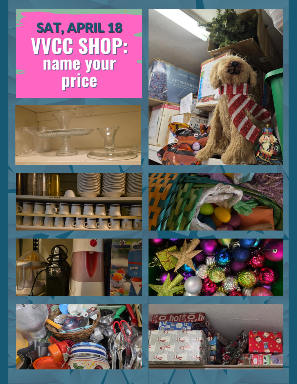 The VVCC has been spring cleaning and will be featuring for sale a wide variety of kitchen gadgets, plates, utensils, tools, and small furniture as well as seasonal decorations and Christmas items.