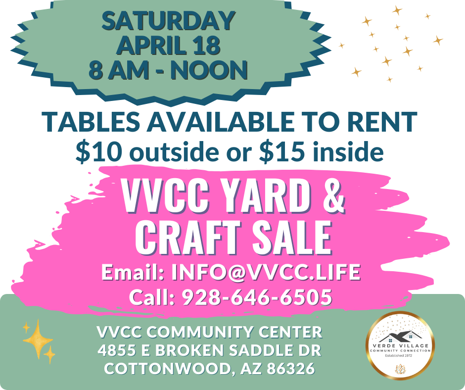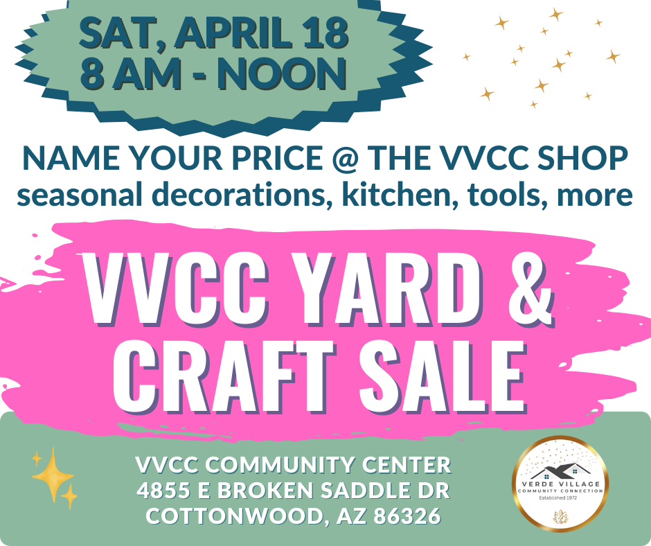 Saturday, April 18 from 8 AM to noon will be an extravaganza of a Yard and Craft Sale at the Verde Village Community Center.